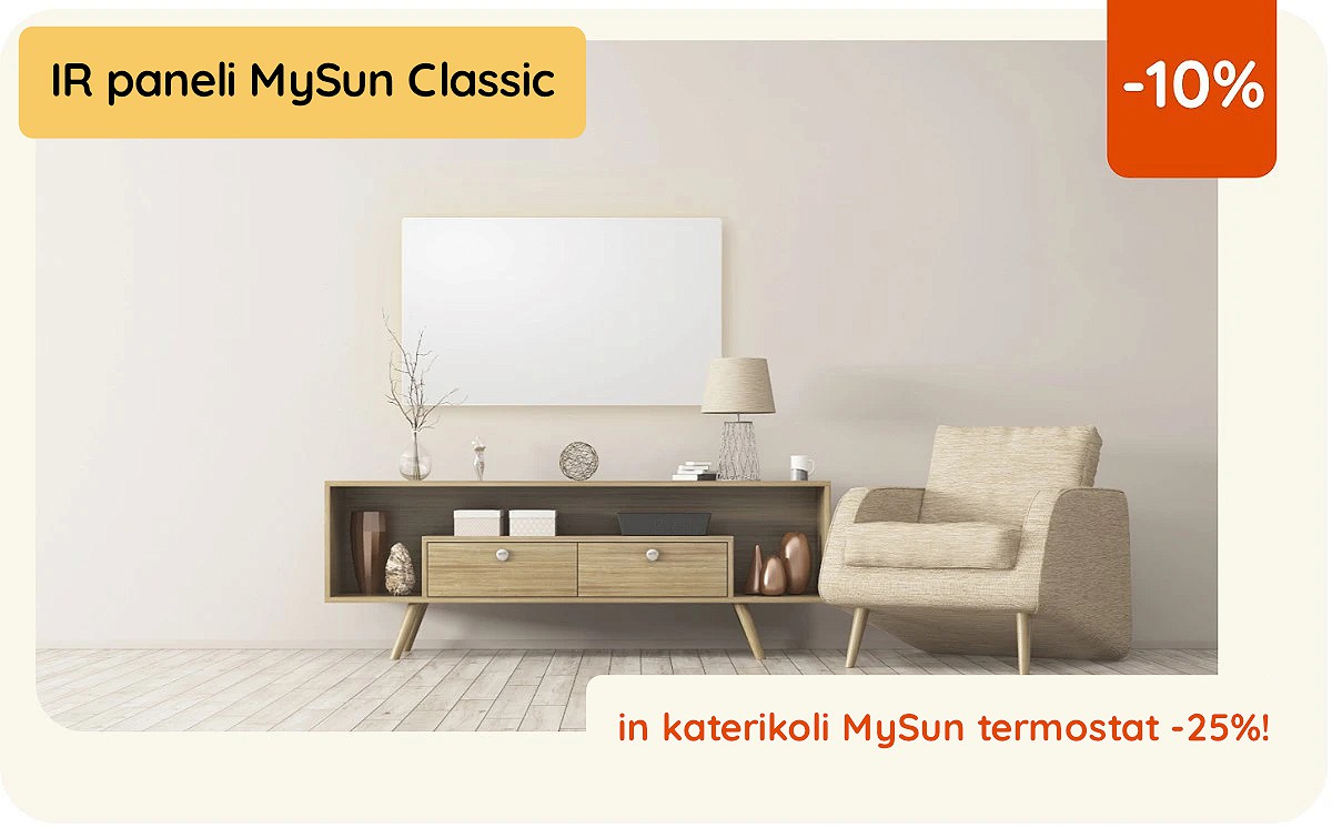 👉 Izkoristite 25% popust na katerikoli MySun termostat za vsak IR panel, dodan v spletno košarico. Akcija velja do 30. 4. 2026.